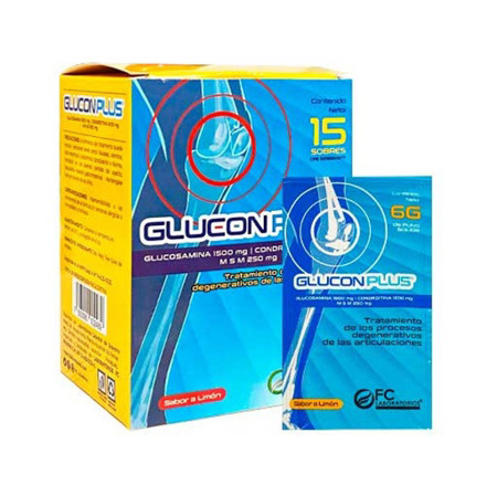 Glucosamina + Condroitina + Msm 1500mg/1200mg/250mg Glucon Plus 1 SobreEs la única combinación de Glucosamina, Condroitina y Metil Sulfonil Metano (MSM) en polvo soluble saborizado (limón) que se disuelve fácilmente y facilita la deglución favoreciendo el cumplimiento del tratamiento. Modo de uso: De 1 a 3 sobres al día, uno con cada comida.